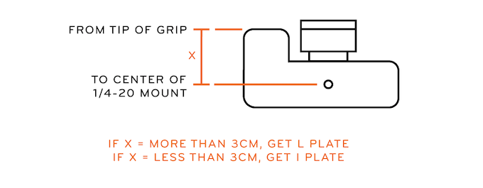 Jak zjistit, zda tvůj fotoaparát spadá do této kategorie? Vezmi pravítko (čím přesnější, tím lépe) a změř vzdálenost od středu stativového závitu k přednímu okraji rukojeti tvého fotoaparátu. Pokud je tato vzdálenost větší než 3 cm, zvol L-plate. Jinak zvol I-plate.