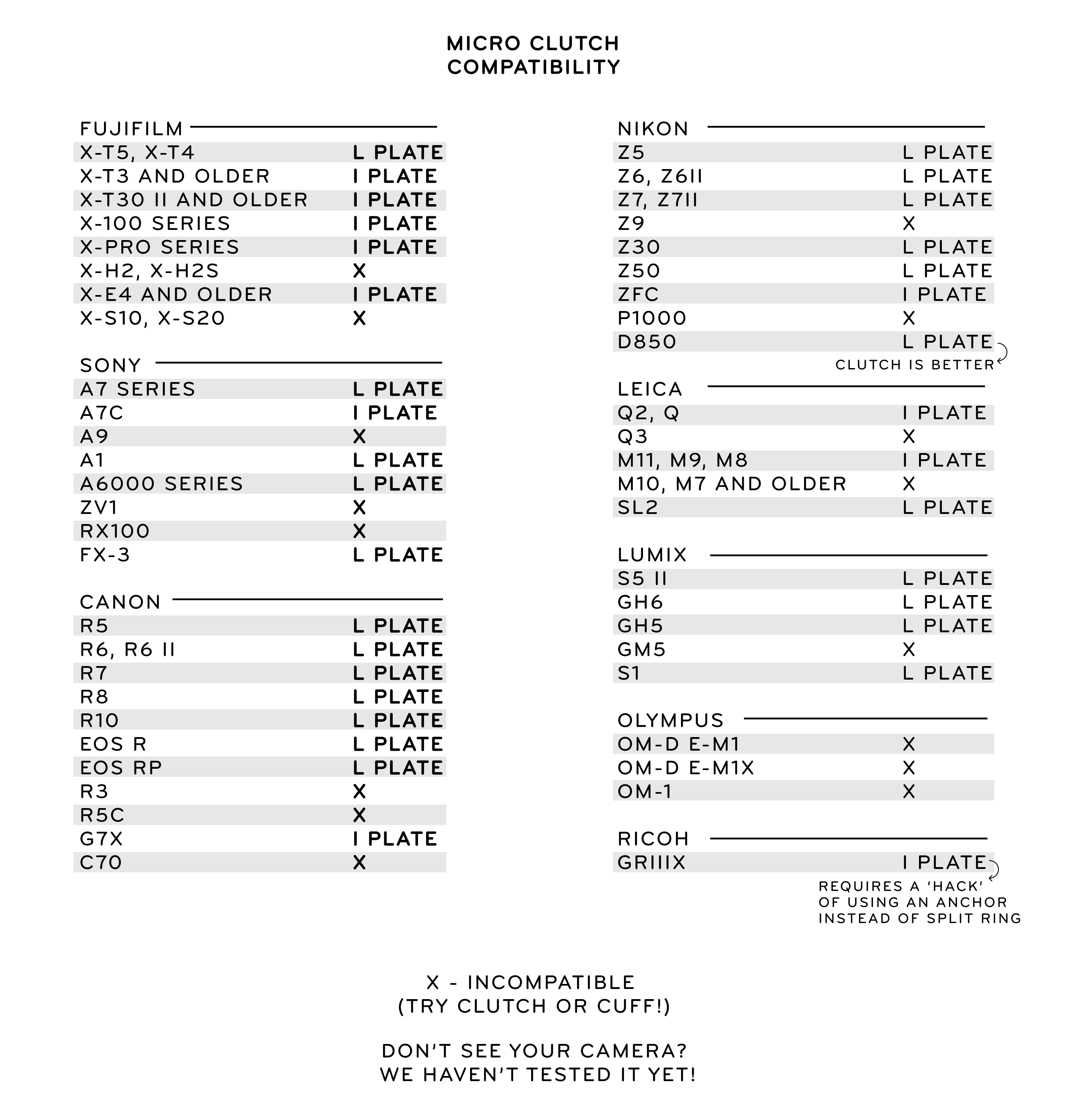Některé bezzrcadlové fotoaparáty mají dostatečně velké tělo a rukojeť, aby fungovaly s Clutch a Micro Clutch. Běžné příklady jsou bezzrcadlové fotoaparáty Leica SL2, Canon řady R a Nikon řady Z. Pokud máš jeden z těchto opravdu velkých bezzrcadlových fotoaparátů a často fotíš s těžkými objektivy, doporučujeme větší popruh Clutch. Pokud však upřednostňuješ menší a elegantnější rukojeť (nebo prostě nepoužíváš velké objektivy často), zvol Micro Clutch s L-Plate.