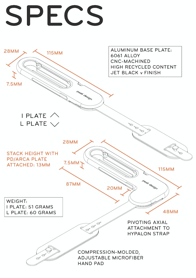 Ano, fyzicky můžeš připojit I-Plate ke kterémukoli fotoaparátu, který je kompatibilní s L-Plate. Nicméně pro L-Plate jsme měli velmi dobrý důvod. Fotoaparát s větší rukojetí tě láká k tomu, abys svou ruku posunul více směrem k přední části fotoaparátu a dál od středu základové desky. Pokud používáš I-Plate na fotoaparátu s výraznou rukojetí, můžeš pocítit větší tlak na polštářek mezi prsty, když se snažíš dosáhnout pohodlné polohy ruky. V L-Plate jsme tento tlak zmírnili posunutím polohy otočné základové desky dopředu směrem k přední části fotoaparátu. Navíc má L-Plate delší hypalonový pás a delší polštářek, aby vyrovnal zvýšenou vzdálenost, kterou potřebuje popruh překonat přes tvou ruku. L-Plate byl optimalizován pro fotoaparáty řady Sony a7, ale bude fungovat i s fotoaparáty s podobným tvarem těla. Fotoaparáty, které jsou příliš velké pro L-Plate, jsou vhodnými kandidáty pro Clutch."