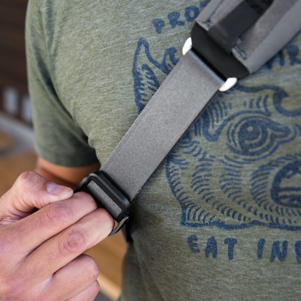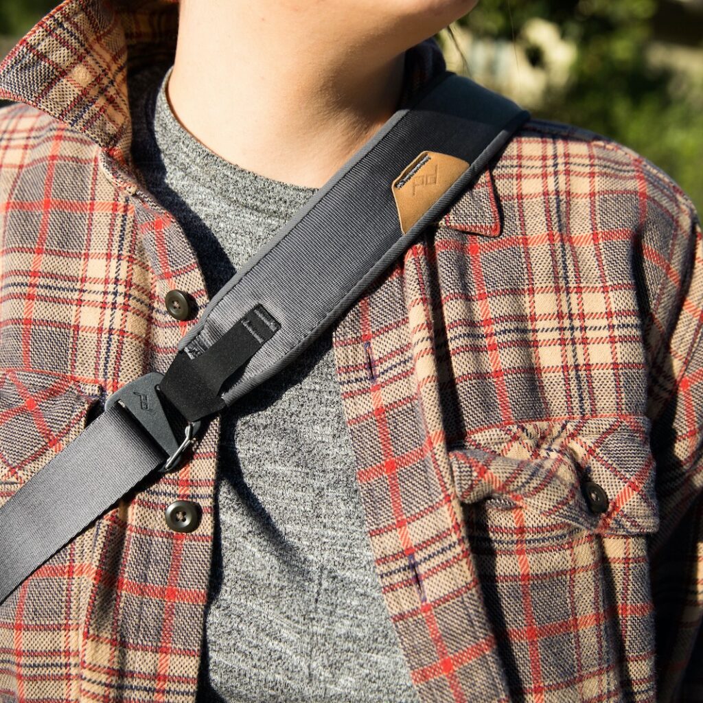 • Bleskurychlé nastavení popruhu: Ramenní popruh má přezku pro rychlé nastavení délky jednou rukou - lze jej rychle uvolnit a jednoduchým pohybem přehodit Sling ze zad dopředu.