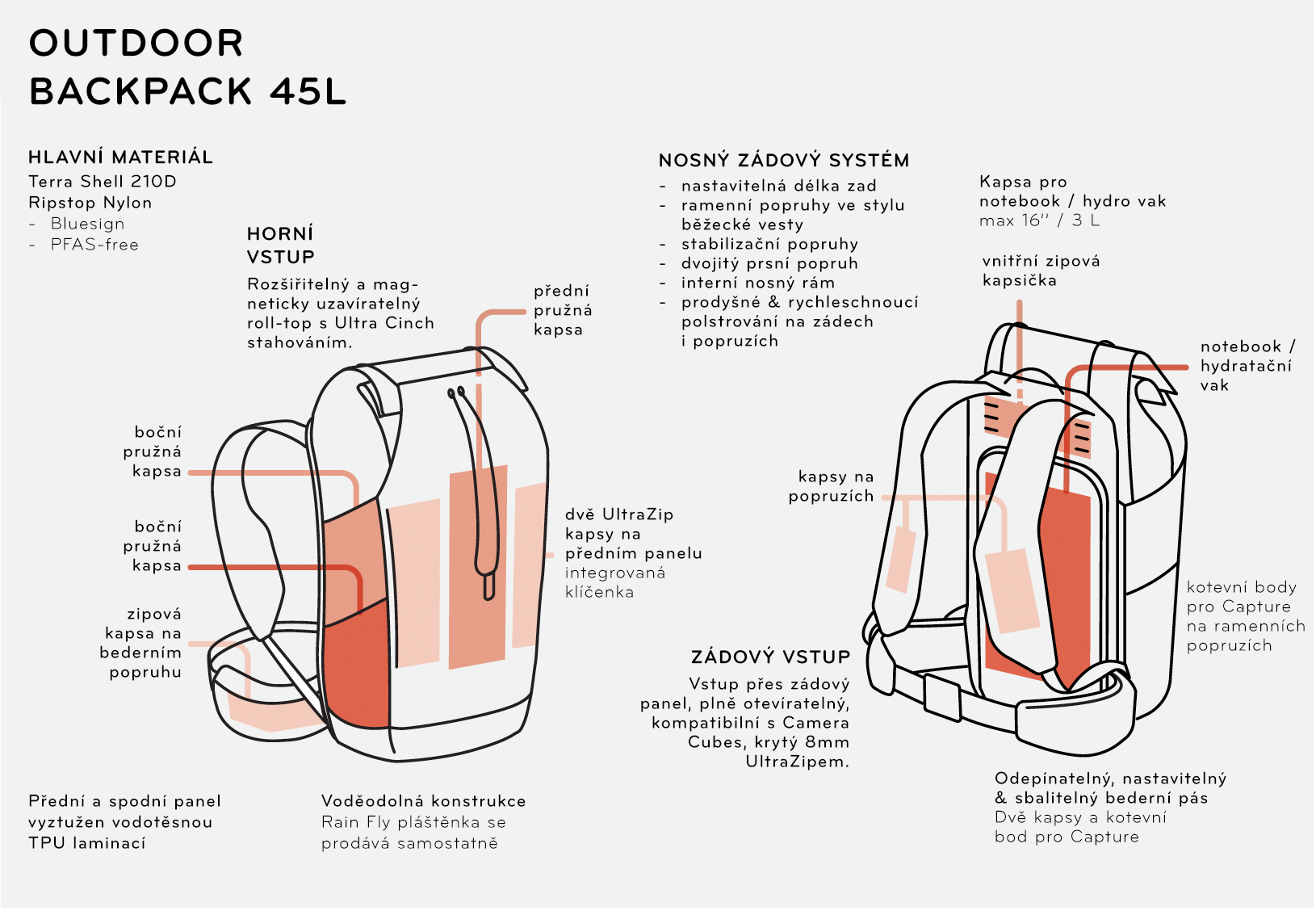 Jedinečný, všestranný a nízkoprofilový nosný systém nabízí maximální pohodlí pro nejširší škálu typů postav. Ramenní popruhy inspirované běžeckými vestami odlehčují zátěž z ramen a paží a rovnoměrně ji rozkládají po větší části těla. Zároveň díky dvěma pružným mesh kapsám poskytují ideální úložiště pro drobnosti, ke kterým cheš mít rychlý přístup (třeba telefon nebo soft flask). Navíc ukrývají upevňovací body pro Capture Camera Clip*. Odnímatelný, snadno uložitelný a plně nastavitelný polstrovaný bederní pás poskytuje pohodlné rozložení zátěže, další úložný prostor (jedna zipová a jedna průhmatová kapsa) a další upevňovací body pro Capture Clip*. Tento batoh je vysoce odolný proti oděru a funkčně voděodolný díky Terra Shell™ 210D ripstop nylonu, který je 100% recyklovaný, schválený certifikací Bluesign a ošetřený nejen impregnací bez PFAS ale také vnitřním PU zátěrem. Volitelná pláštěnka Rain Fly* poskytuje plnou ochranu proti vodě. více