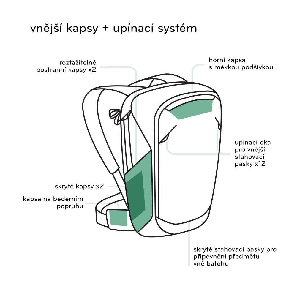 • Skryté stahovací pásky pro jednoduché připevnění předmětů vně batohu