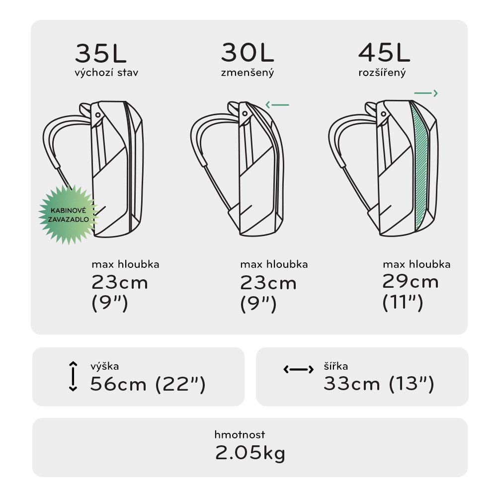 • Možno zmenšit až na velikost 30L batohu pro každý den