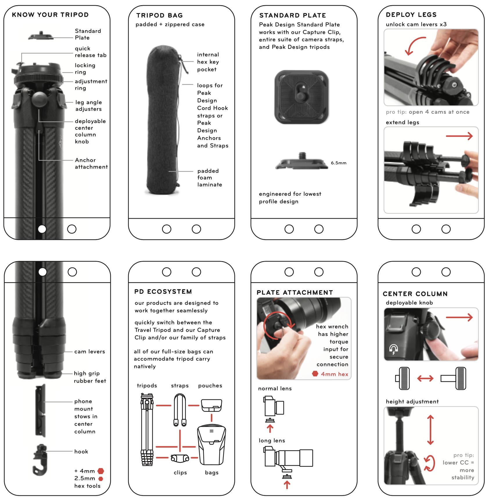 4. PD ECOSYSTEM – PD ekosystém | our products are designed to work together seamlessly – naše produkty jsou navrženy tak, aby spolu perfektně spolupracovaly | quickly switch between the Travel Tripod and our Capture Clip and/or our family of straps – rychlé přepněte mezi stativem Travel Tripod a naším držákem Capture nebo našimy popruhy | all of our full-size bags can accommodate tripod carry natively – všechna naše zavazadla (kromě nejmenších) jsou přizpůsobena pro přepravu Travel Tripod