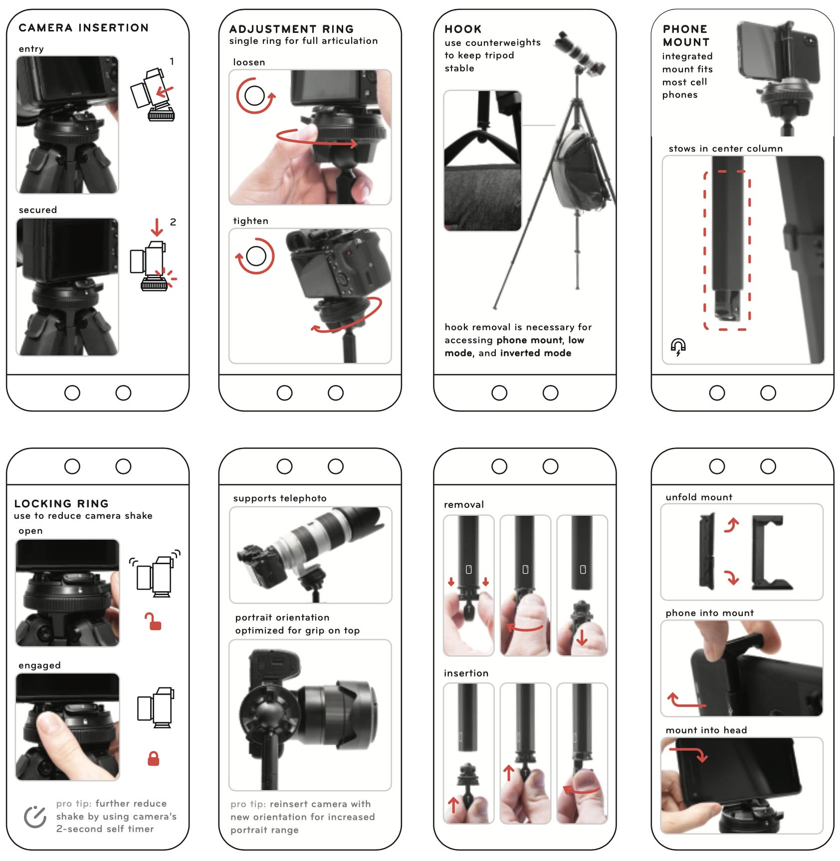 1. LOW MODE – nízký režim | capture unique perspectives – pro focení z nízké perspektivy | remove hook – odpojte hák | remove center column – vysuňte středový sloupek