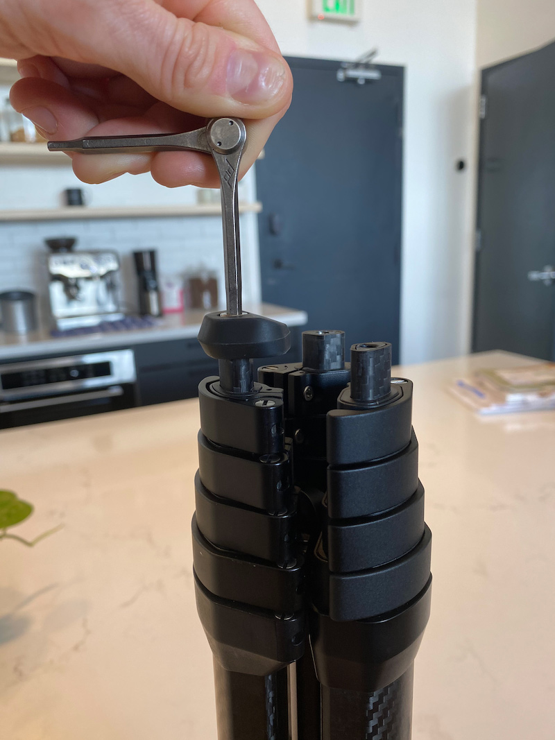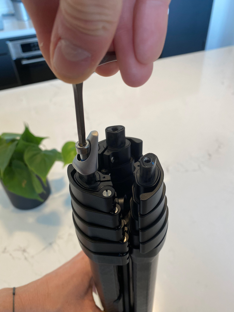 1. Otočte stativ vzhůru nohama. Ve spodní části uvidíte šroub se šestihrannou hlavou ve středu gumových patek.